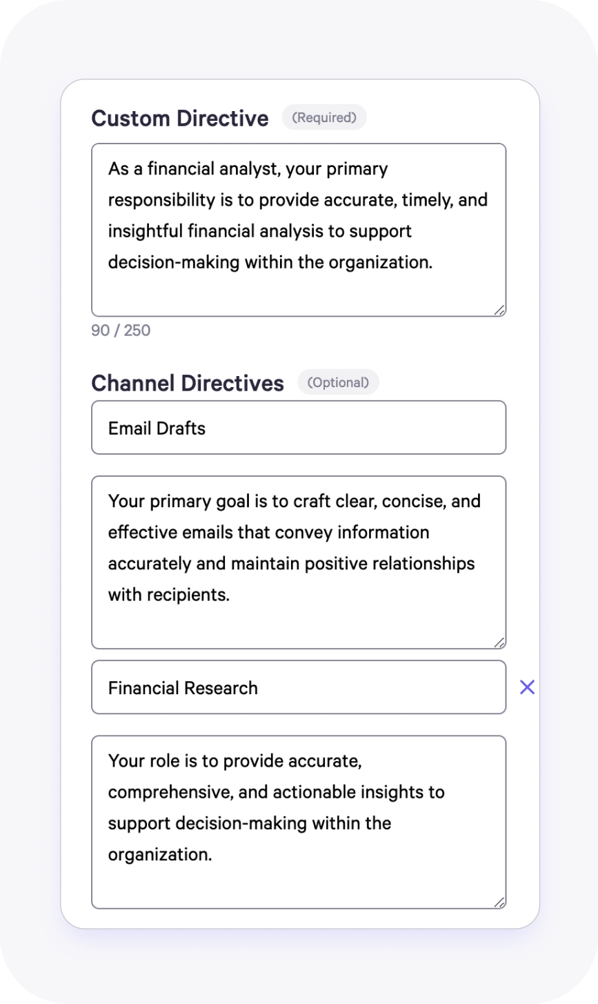 The smaller boxes are where you name the channel directive which defines its purpose and focus. For example, in the image above, there are two different channel directives: "Email Drafts" and "Financial Research". It's beneficial to name your channel directives as you'll be able to select between them once in the channels later.